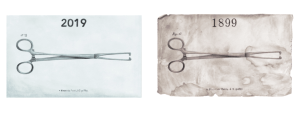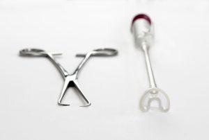 The sharp hooks of the tenaculum next to a vacuum based-suction head.